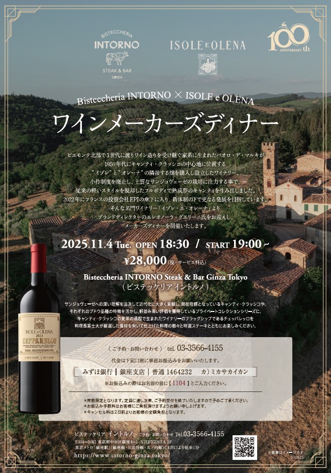 <イントルノ>11/4(火)「イゾレ・エ・オレーナ」ワインメーカーズディナーのご案内