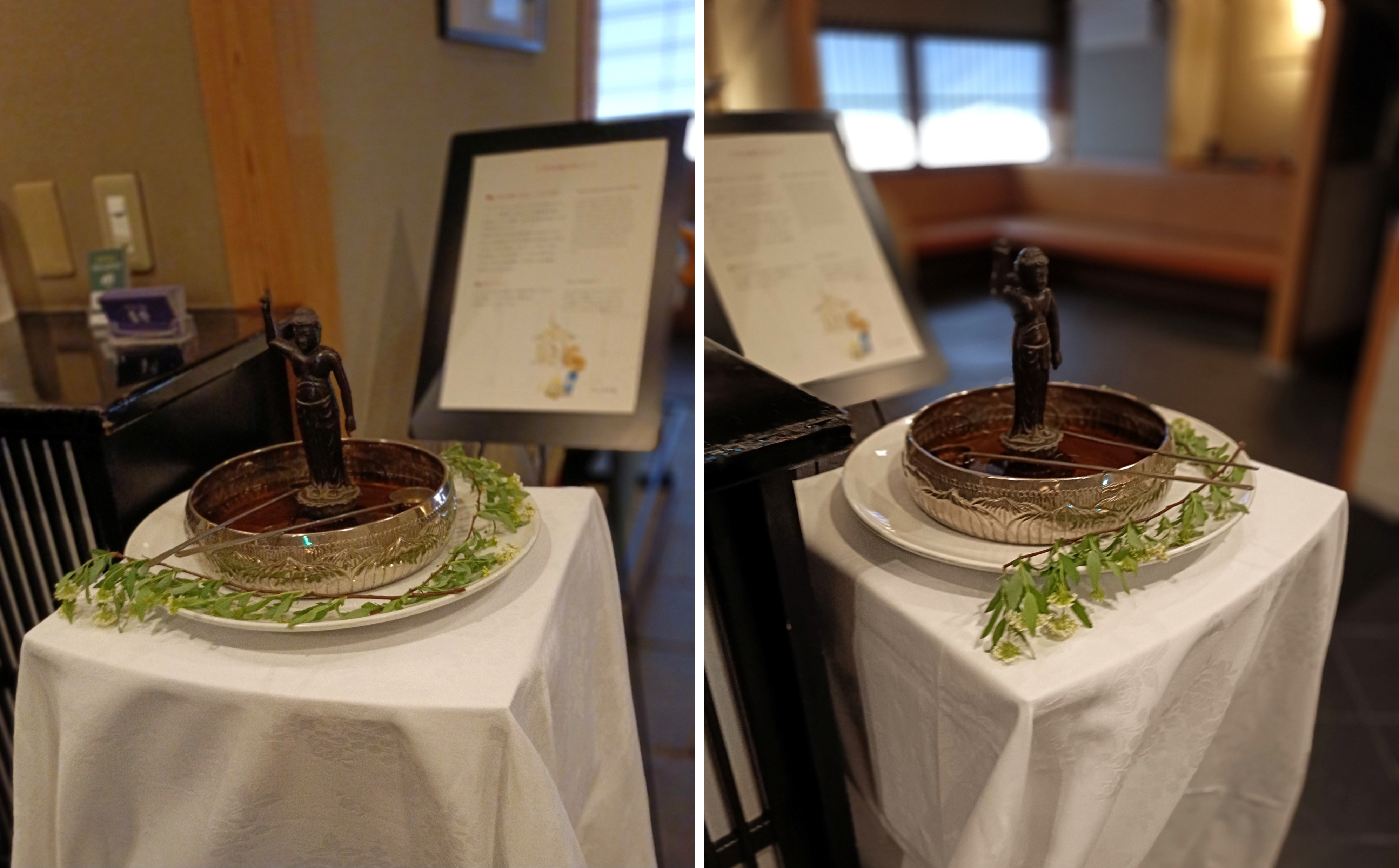 本日より甘茶の入った水盤を設え、お釈迦様の像(誕生仏)をお祀りしております。