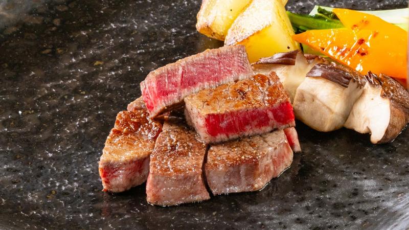 茨城県産のブランド牛「煌」の希少部位ランプ/イチボステーキをメインにしました。