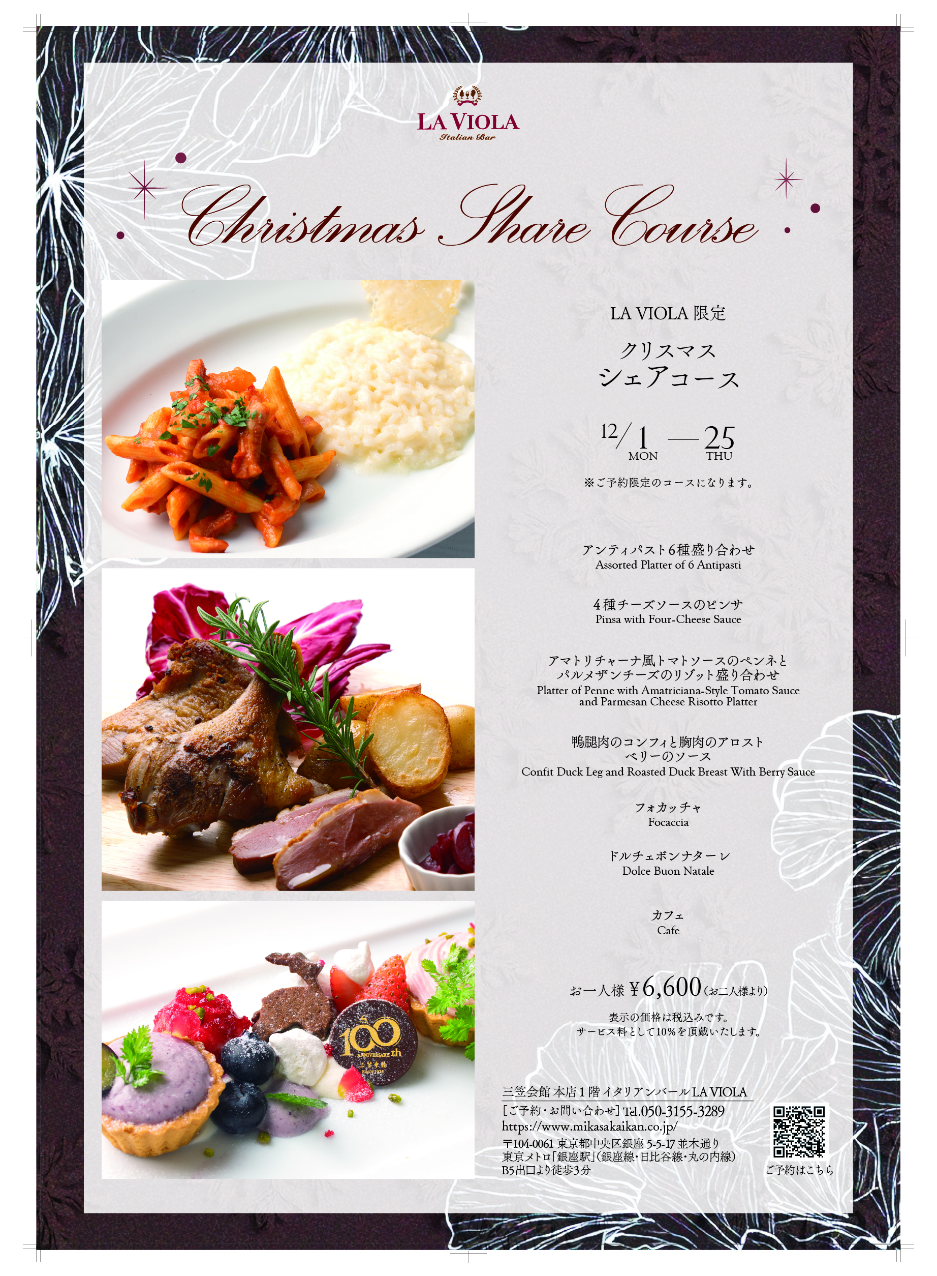 三笠会館 本店1階 イタリアンバール LA VIOLAよりクリスマスメニューのご案内をいたします