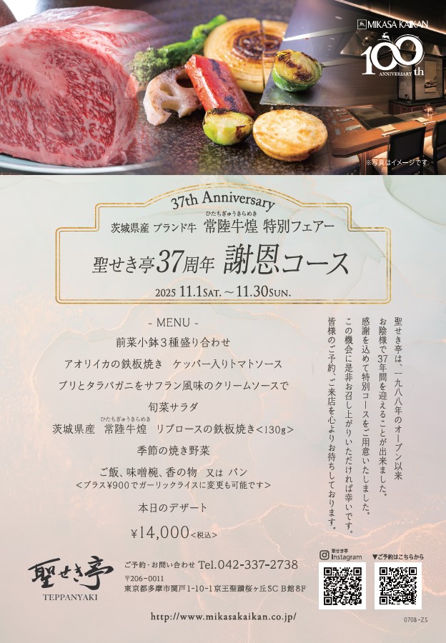 <聖せき亭>【11/1~11/30限定】37周年謝恩コース<茨城県産ブランド牛『常陸牛 煌』特別フェアー>