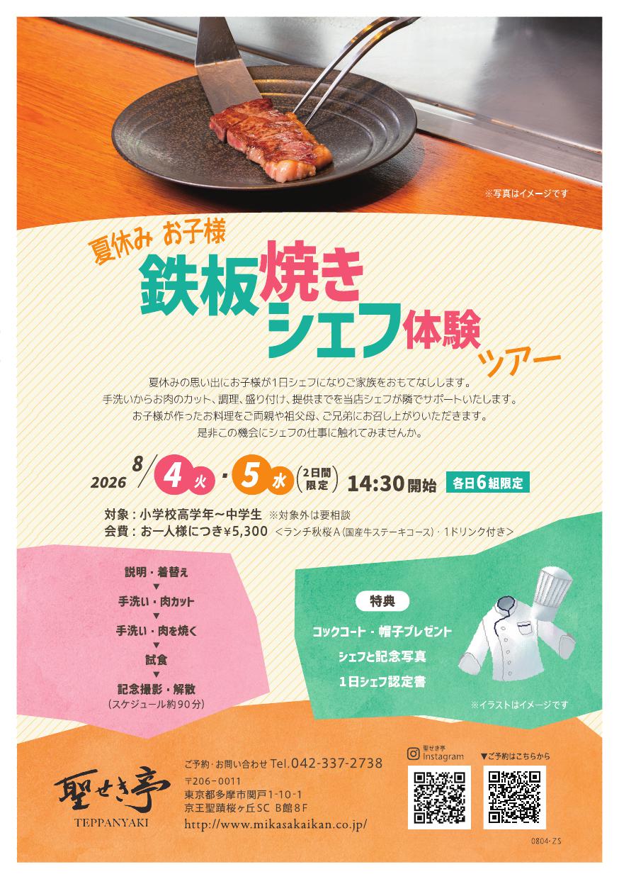 <聖せき亭>夏休み 鉄板焼きシェフお子様体験ツアー<8/4(火)~5(水)限定>