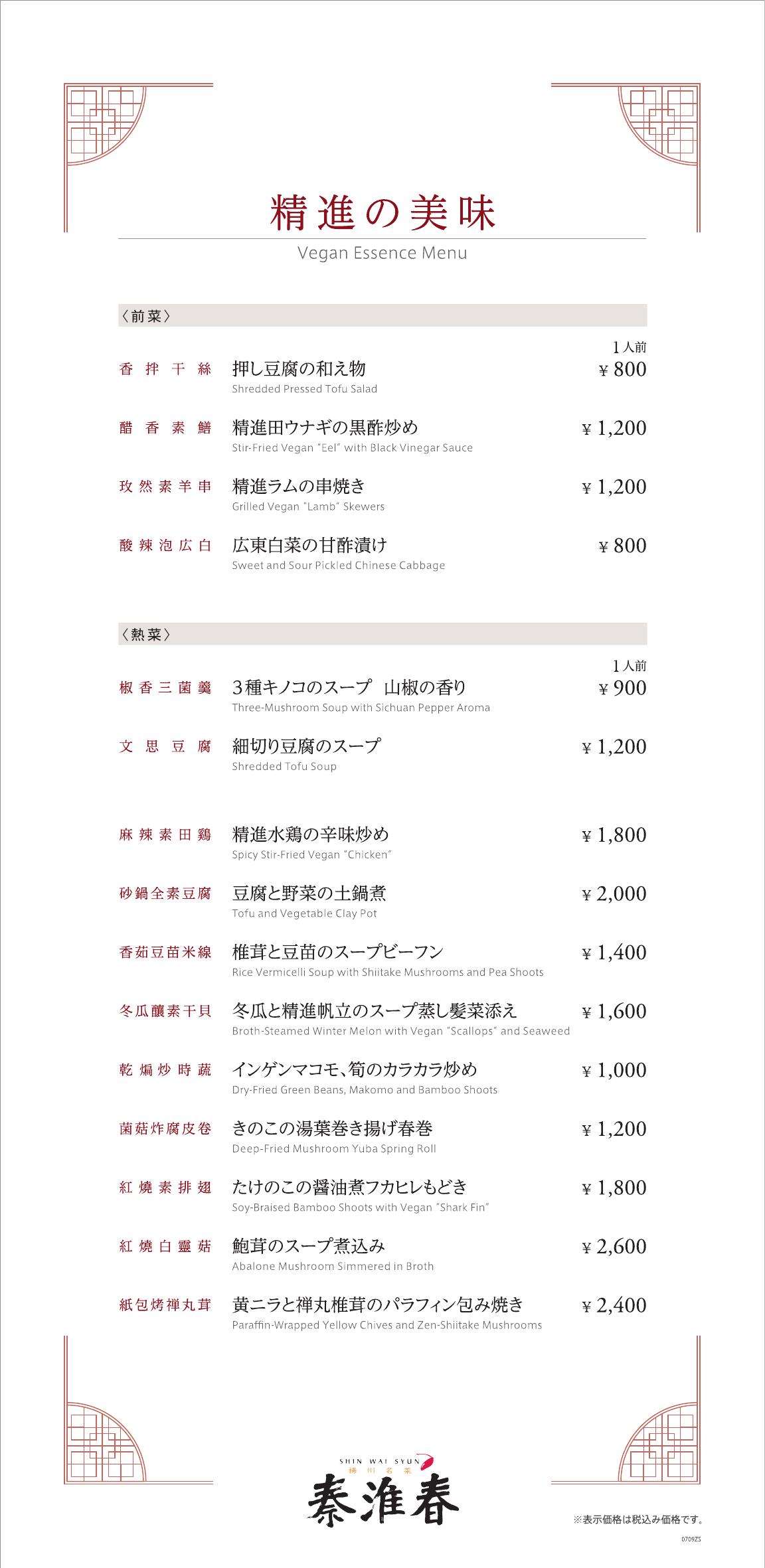 <本店4F 秦淮春>ビーガン メニューのご案内/精進の美味 -Vegan Essence Menu-