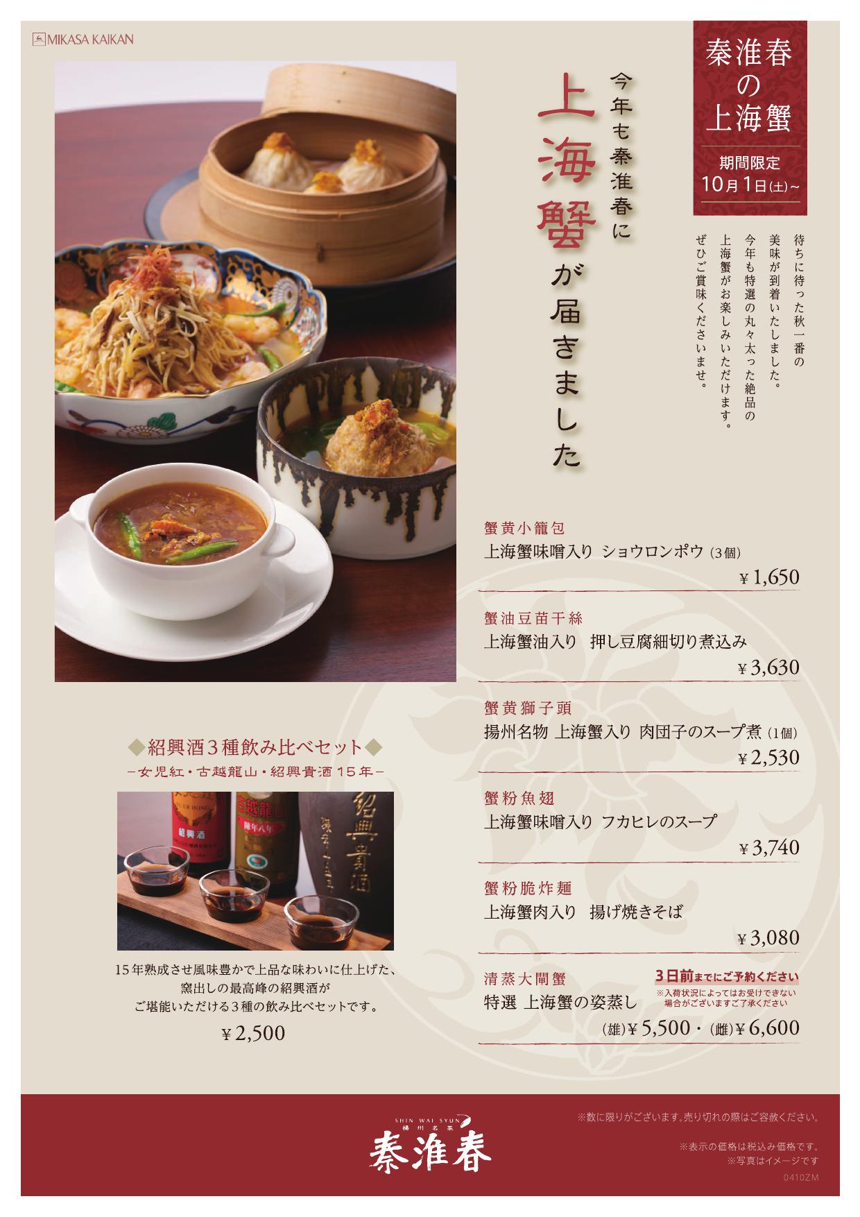 <秦淮春>秋の美味「上海蟹」コース・アラカルトのご案内