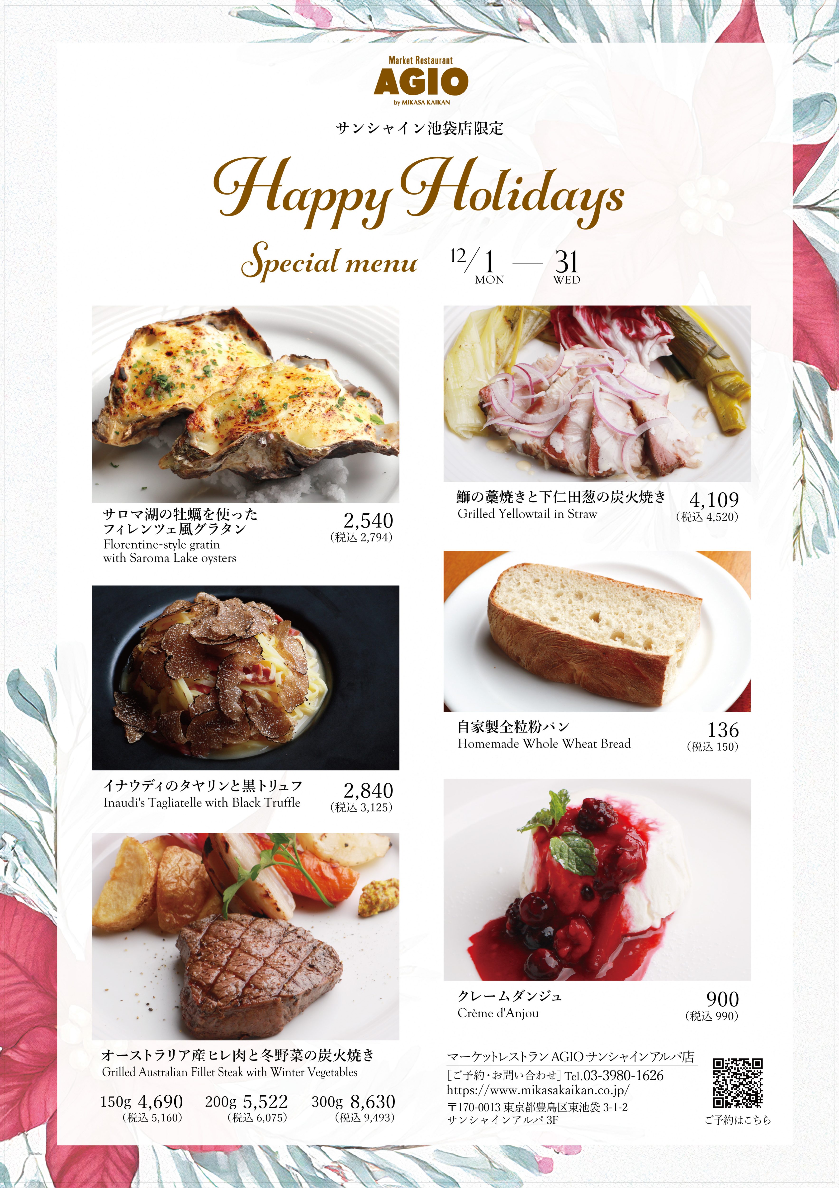 AGIOサンシャインアルパ店よりハッピーホリデースペシャルメニューのご案内をいたします。