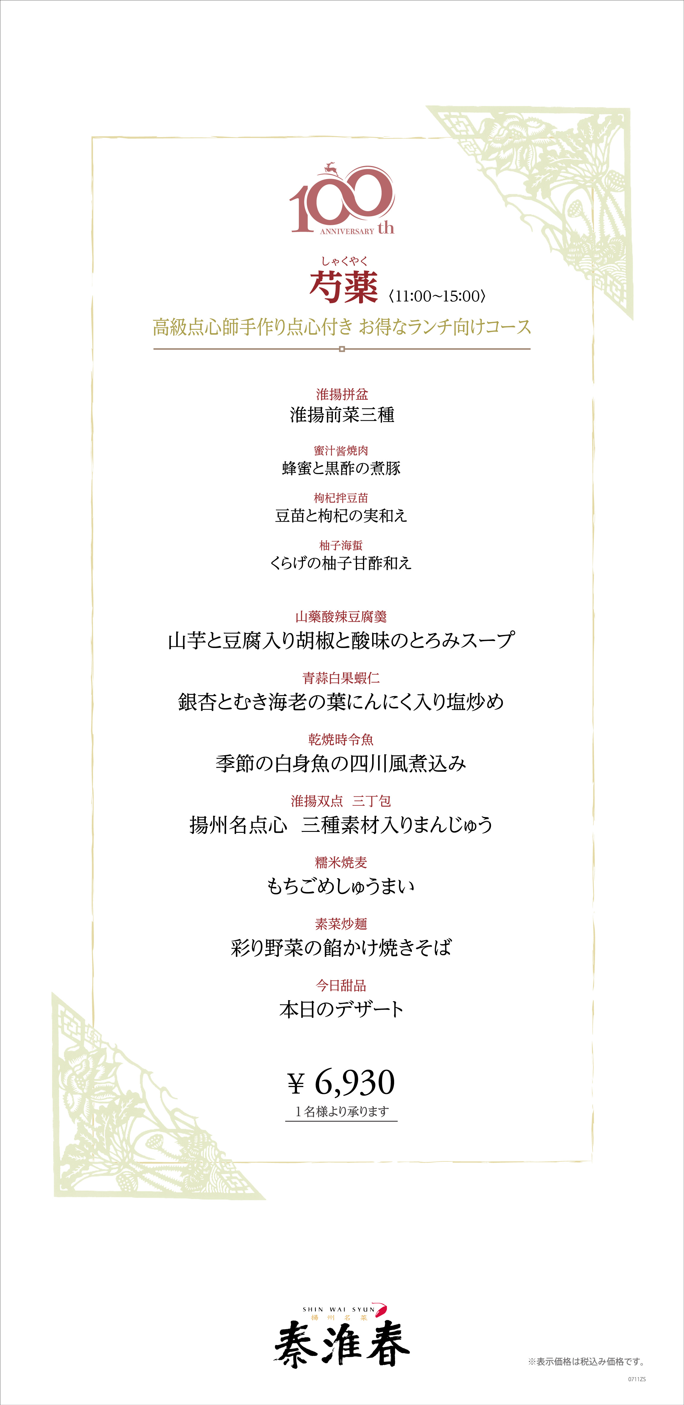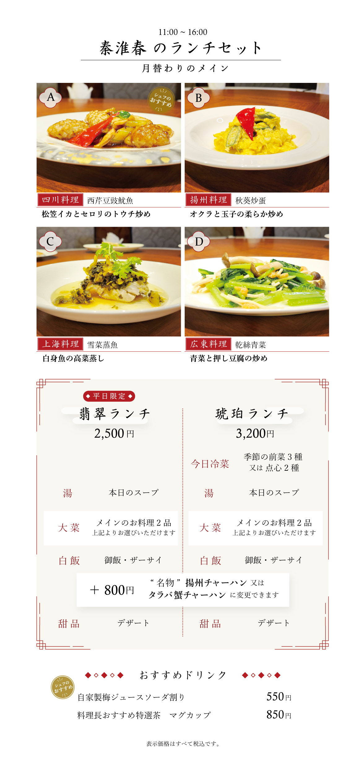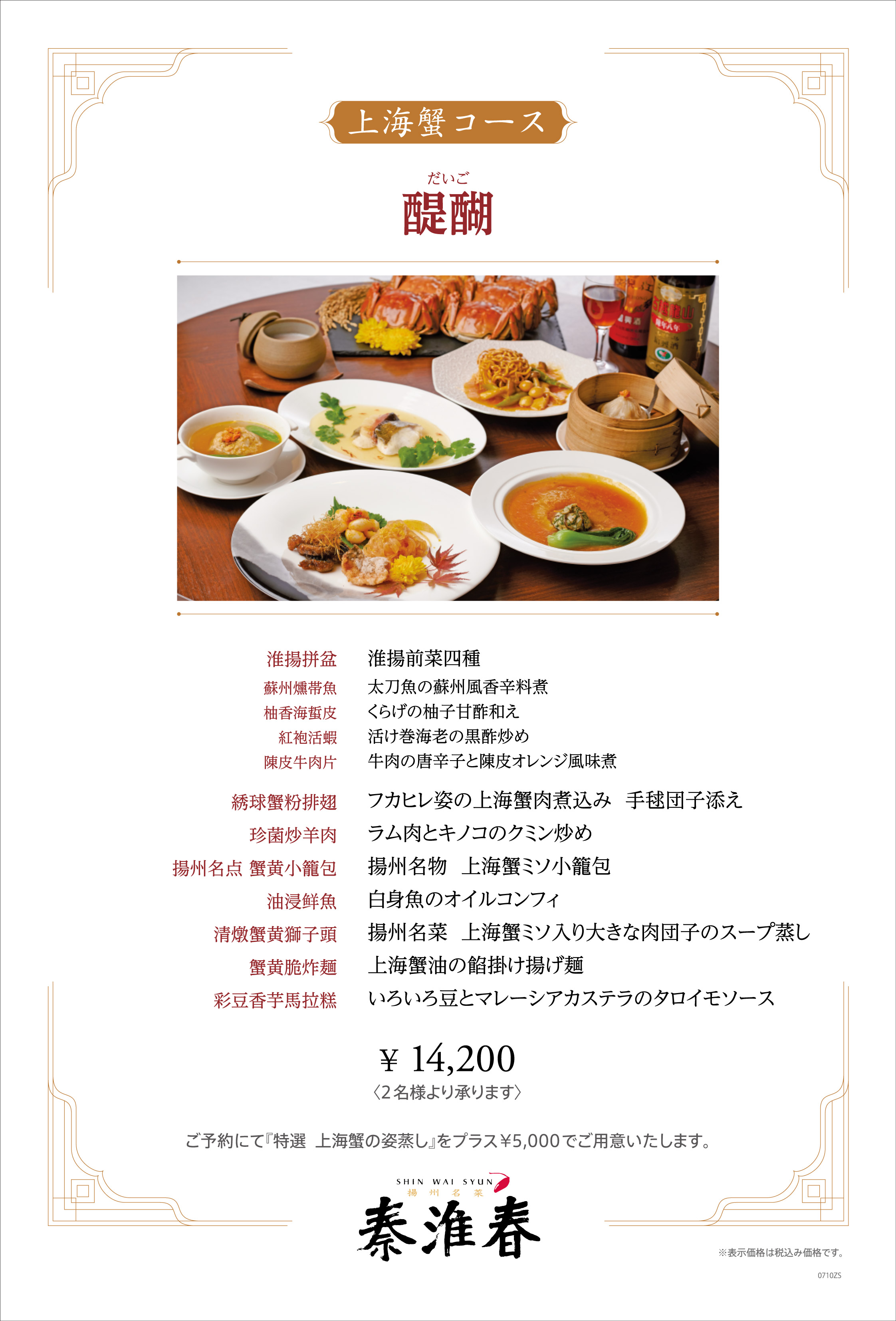 季節と共に素材を変え、旬味を味わう優しい味付けの揚州名菜。彩り豊かな二十数種類の前菜や、豆腐・野菜料理など、中国料理の中で最も上品で洗練された名菜といわれる揚州料理の真髄をお届けいたします。
