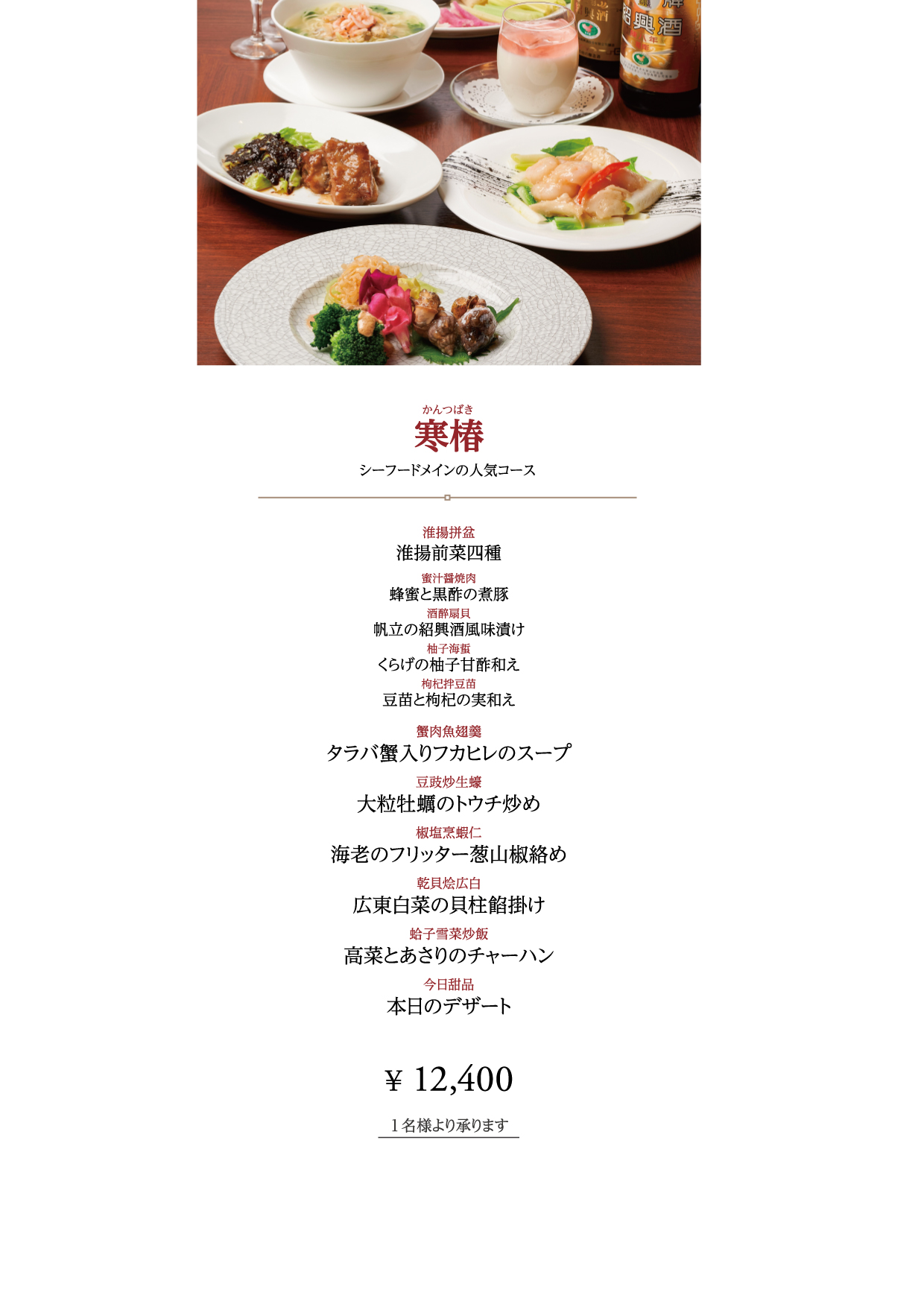 季節と共に素材を変え、旬味を味わう優しい味付けの揚州名菜。彩り豊かな二十数種類の前菜や、豆腐・野菜料理など、中国料理の中で最も上品で洗練された名菜といわれる揚州料理の真髄をお届けいたします。
