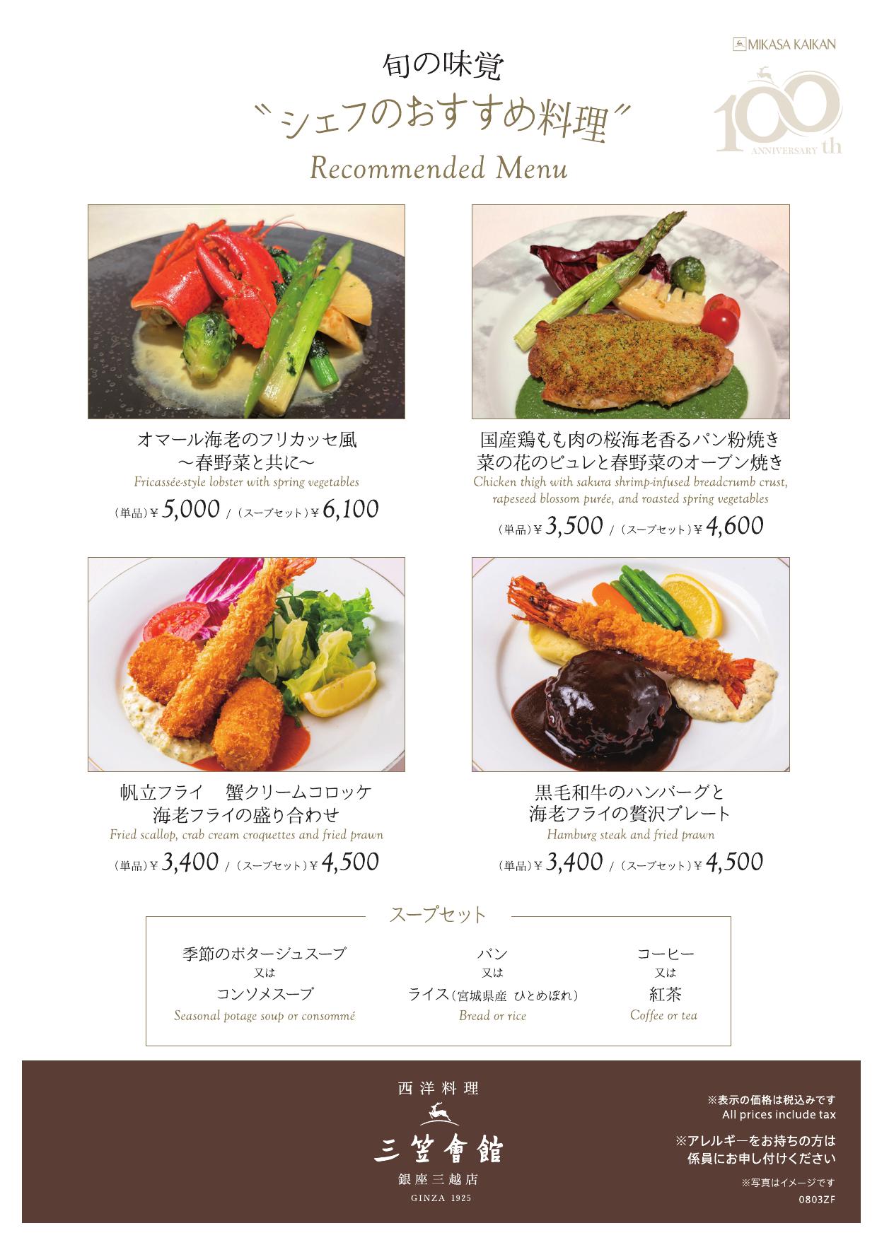 1925年(大正14年)創業以来、受け継がれ、磨かれてきた三笠会館の原点である洋食をあたたかいおもてなしの心で提供しております。どこか懐かしく、そして今を生きる人びとに寄り添う料理を銀座の景色とともにお楽しみください。